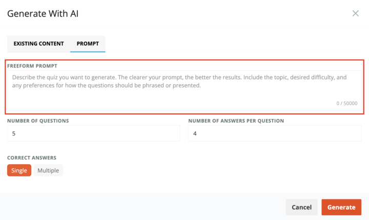 It’s now possible to generate quiz questions using a freeform prompt. The clearer the prompt, the better the results - include the topic, preferred difficulty, and any notes on how the questions should be phrased.