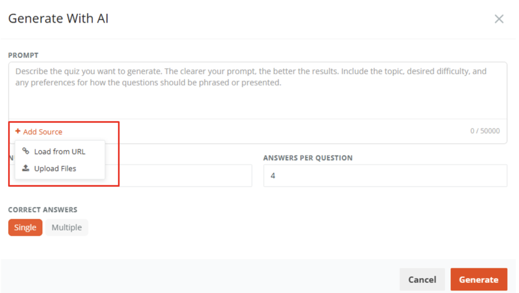 Add Source: In addition to using a prompt, you can provide source material to generate more targeted questions. We have added the option to also upload source files directly. Currently supported file types are PowerPoint (.pptx) and PDF, with a maximum file size of 5 MB per file and a total content limit of 1,000,000 tokens (approximately 700,000 words) across all uploaded files.