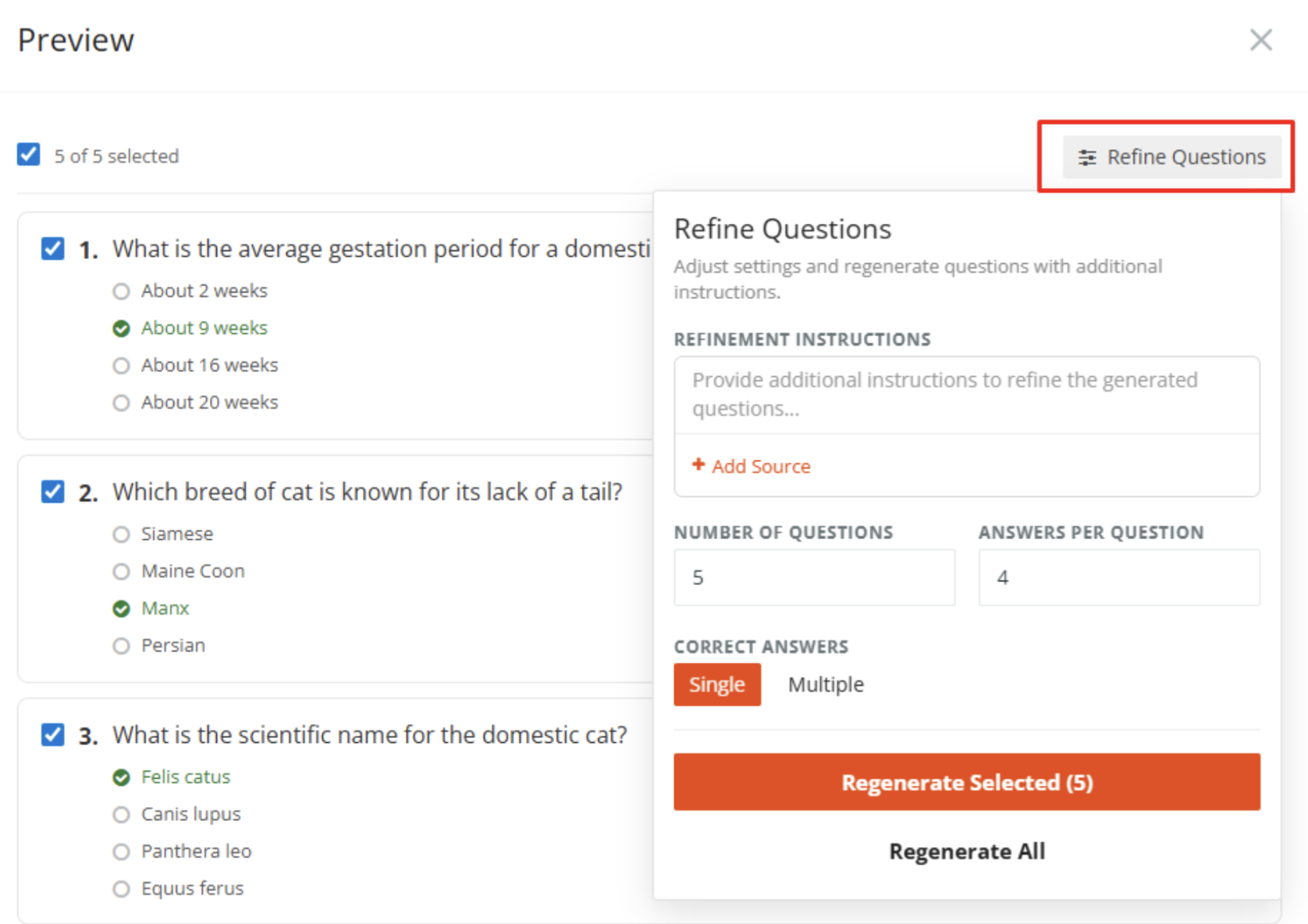 Refine Questions: Once your questions have been generated, you have the option to refine them. All questions are selected by default - you can deselect any question by clicking the checkbox icon next to it. You can also provide additional context or instructions and regenerate questions, allowing you to refine and improve the AI-generated output without starting the entire process over.