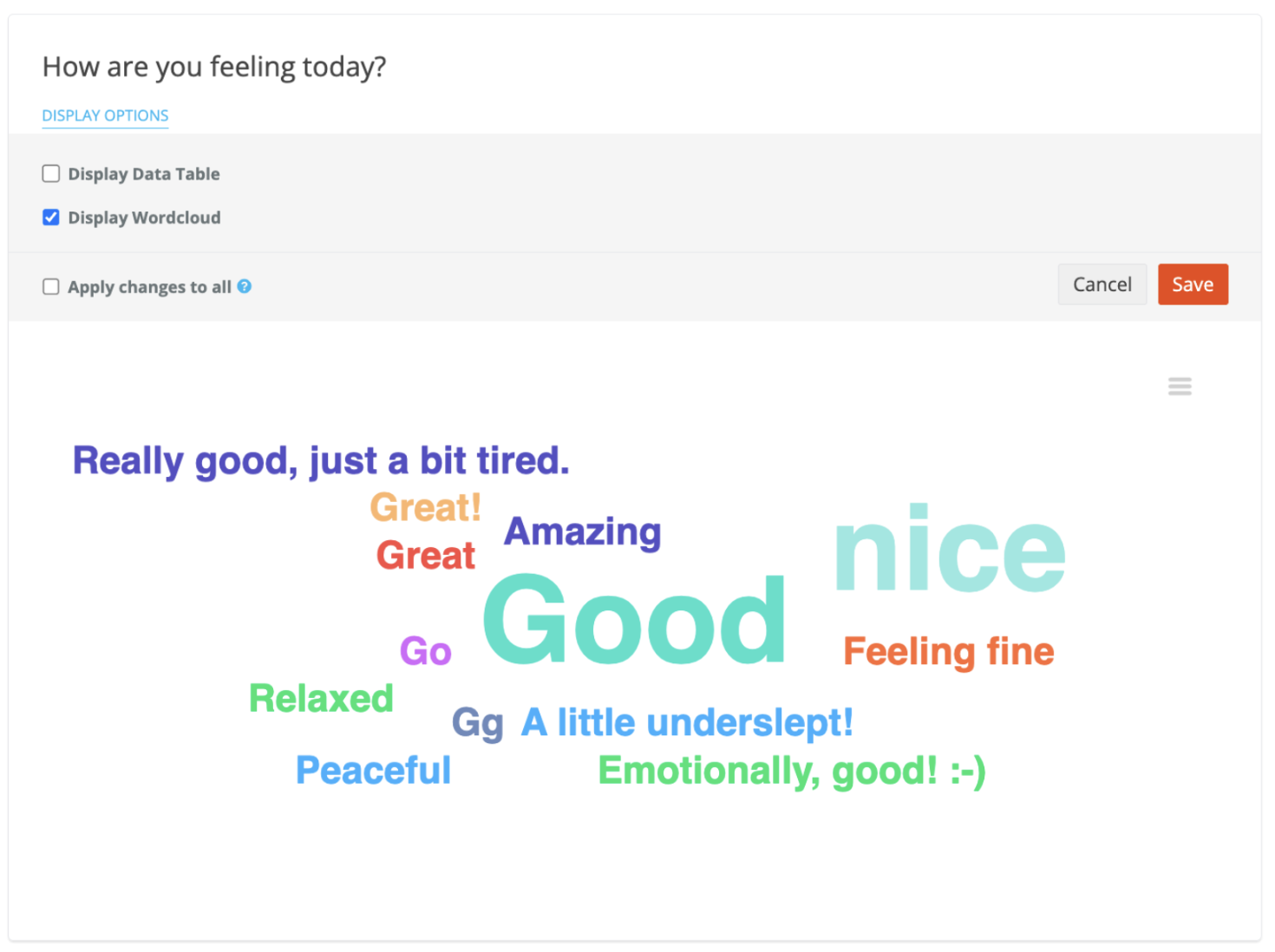 We have added a new display option for Short Answer and Wordcloud question types in Reports. You can now choose to display responses as a Wordcloud, a Data Table, or both.