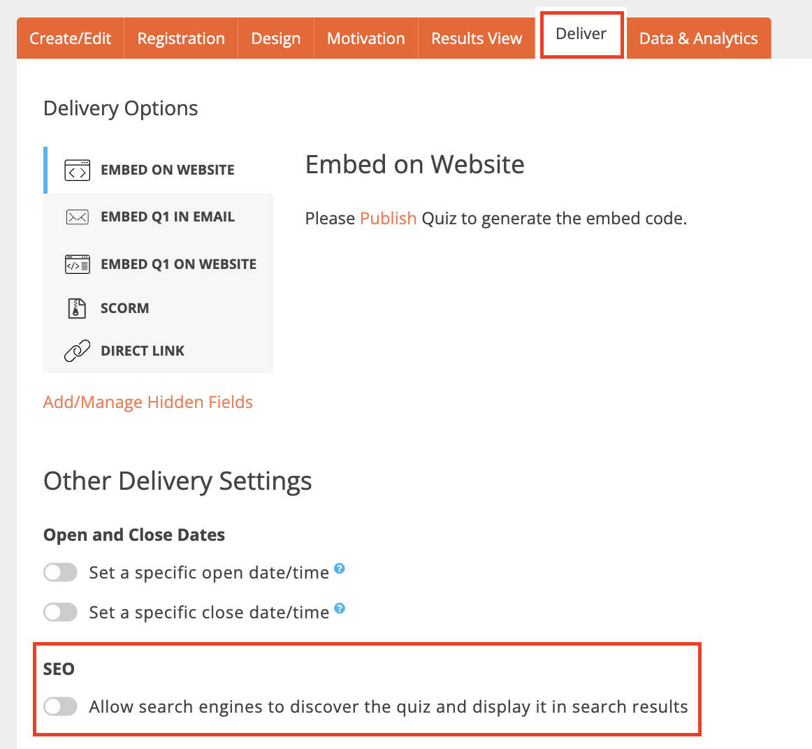 To enable SEO, go to the “Deliver” tab and enable the “Allow search engines to discover interaction and display it in search results” toggle: