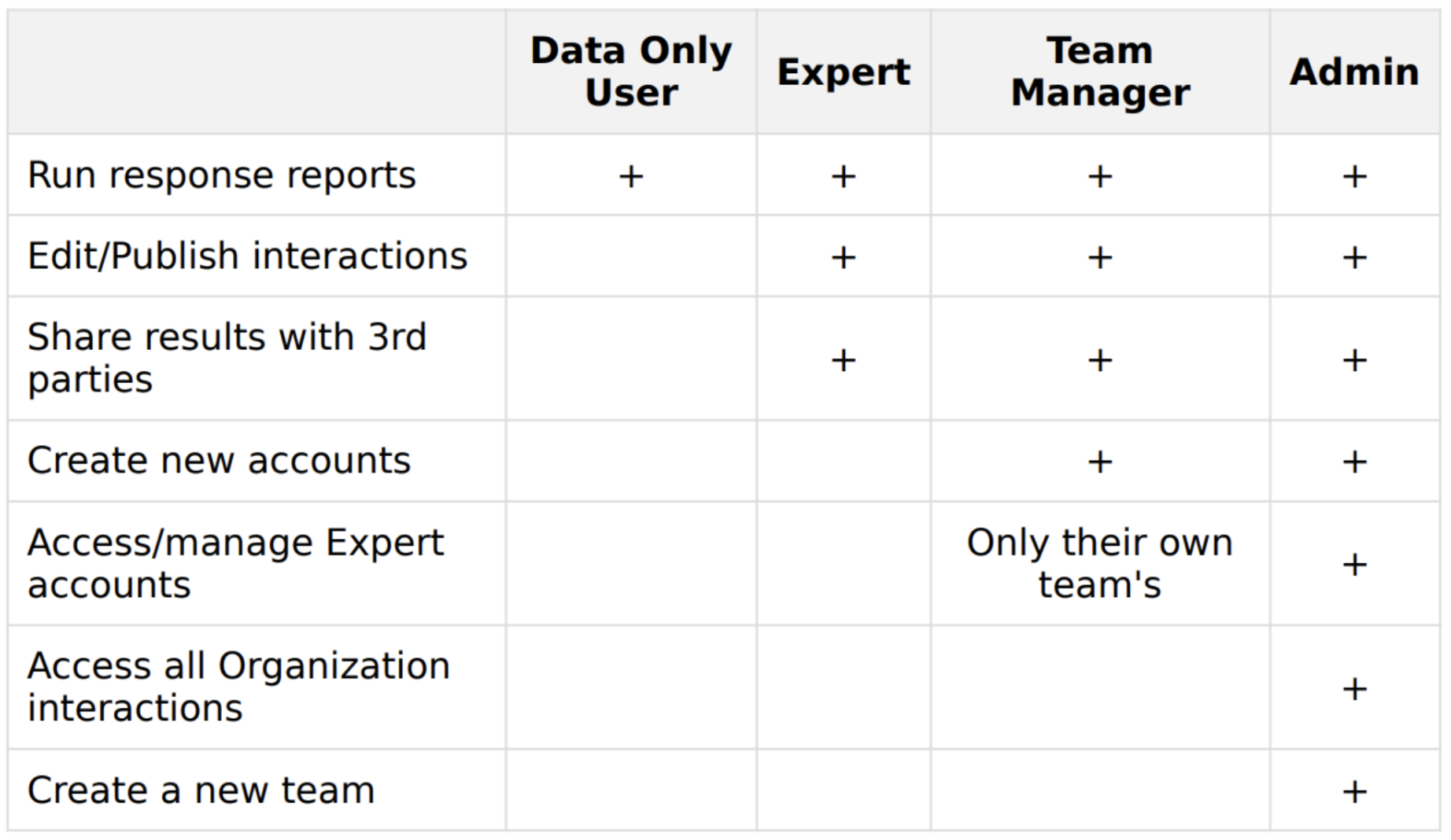 Before we dig deeper, let’s lay out the differences in functionalities between Admin, Team Manager, Expert and Data Only User accounts: