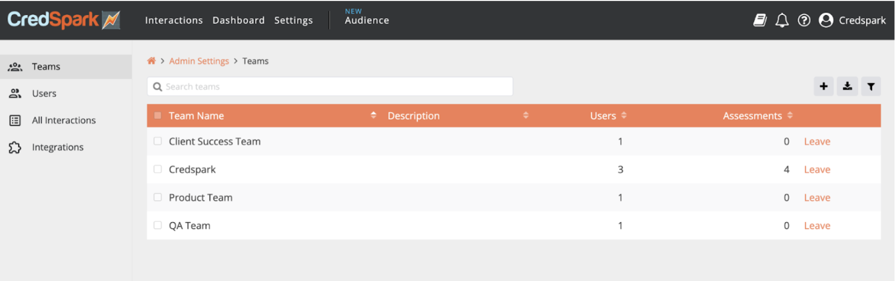 You will be directed to the Admin Settings page where you can see all Teams, Users, Interactions and Integrations within your organization: