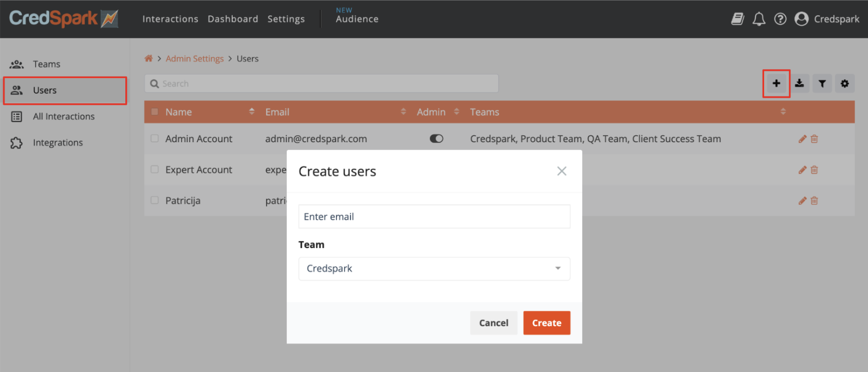 Admins can create new user accounts from the “Users” tab. To create a new user from the Users tab click on the “+” icon on the right side. A modal will appear where you can enter the email address of the person you want to invite. Each user has to have a team, so you will be asked to assign one: