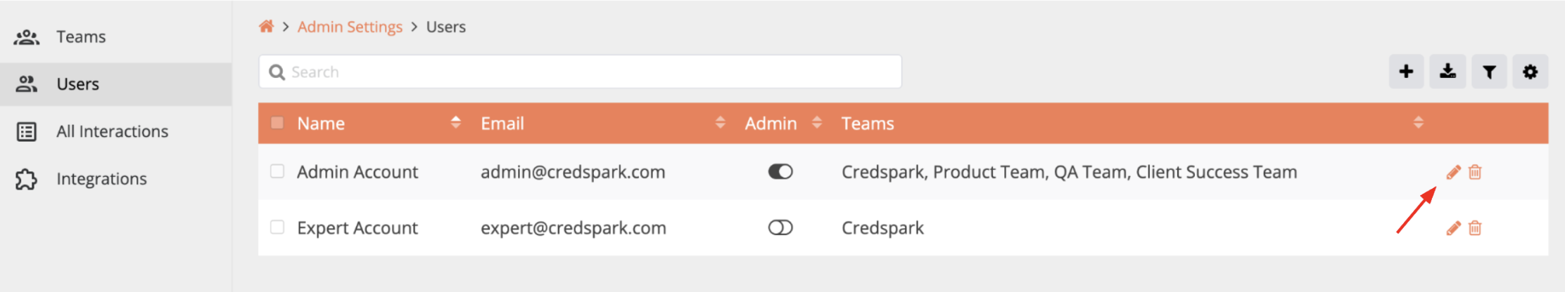 In order to edit a user's name or email, click on the edit icon on the right. Please note that these changes are applied as soon as they are made, and no confirmation emails will be sent to users.