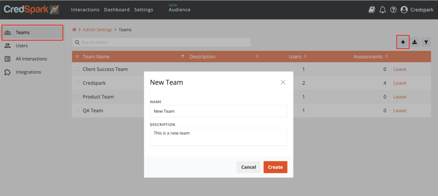 As an Admin you can create a new team. Teams are useful if you have multiple brands or departments and you want to have separately managed accounts. To create a new team go to the Teams tab and press the “+” icon: