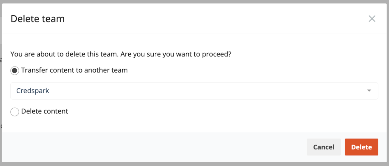 Only Admins (i.e. Organization level) have the right to delete a Team. This action is not reversible so be very careful when you decide to delete the team. Go to the Settings page of the team you want to delete and click the “Delete Team” button. You have an option to transfer team’s content to another team: